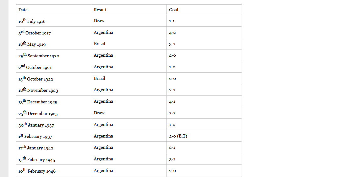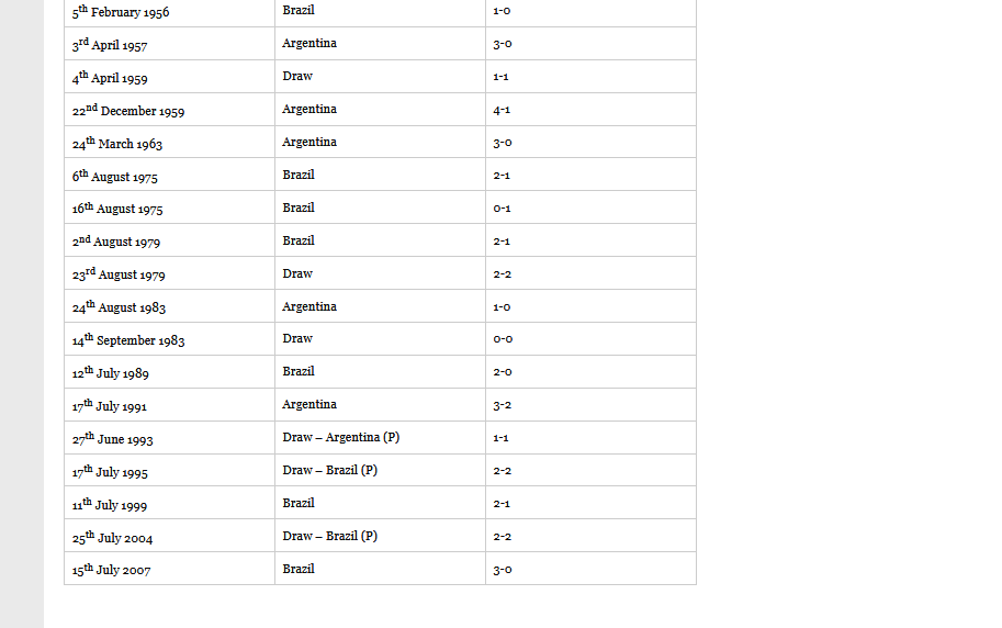 विश्वकप, ओलम्पिक र अन्य खेलहरुको संख्या जोड्ने हो भने दुवै देश ५९ पटक आमनेसामने भएका छन्। त्यसमा ३२ अर्जेन्टिना र २७ ब्राजिलको पक्षमा निर्णय भएको देखिन्छ। कोपा अमेरिका कपमा पछिल्लो पटक २००७ मा यी दुई देशको भिडन्त हुँदा ३–० ले ब्राजिलले आफ्नो पक्षमा नजिता पारेको थियो। त्यसअघि २००४ को खेलमा २–२ को बराबरी भएको थियो र नतिजा ब्राजिलको पक्षमा पुगेको थियो।