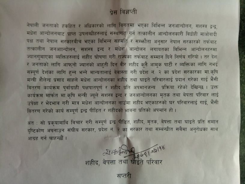 शनिबार सप्तरी सदरमुकाम राजविराजमा आयोजित पत्रकार सम्मेलनमा सहिद, बेपत्ता तथा घाईते परिवारकी अध्यक्ष रीताकुमारी चौधरीले शहिद कुनै अमुक पार्टी र व्यक्ति विषेश नहुने भन्दै राजनितिक परिवर्तन र अधिकार प्राप्तीका बलिदानीको सरकारले नै अपमान भएको गुनासो गरिन्।
