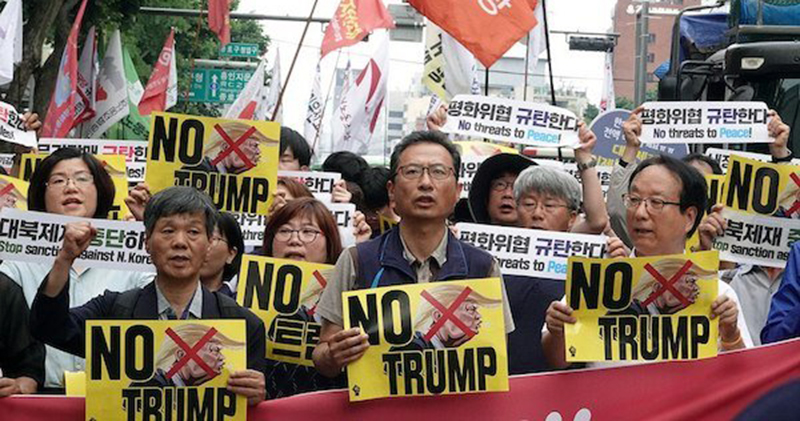 आप्रवासीहरुप्रति कठोर नीति लिएका ट्रम्पको कोरिया भ्रमणको विरोध गर्दै राजधानी सोलमा निकालिएको र्यालीमा सहभागीहरुले ‘नो ट्रम्प’, 'नो टच साउथ कोरिया' लेखिएका पम्प्लेट बोकेका थिए।