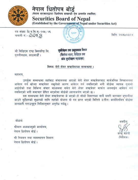 ‘मेरो सेयर सफ्टवेयरमा के भएको हो? सोको विवरण साथै यसरी बारम्बार प्रणालीमा आउने त्रुटीहरुको सुधारका लागि सिडिएसको योजना यो पत्र प्राप्त भएको मितिले ३ दिनभित्र बोर्डमा जानकारी गराउन हुन निर्देशानुसार अनुरोध छ,’ बोर्डले मंगलबार स्पष्टीकरण माग गर्दै सिडिएसलाई पठाएको पत्रमा उल्लेख छ।