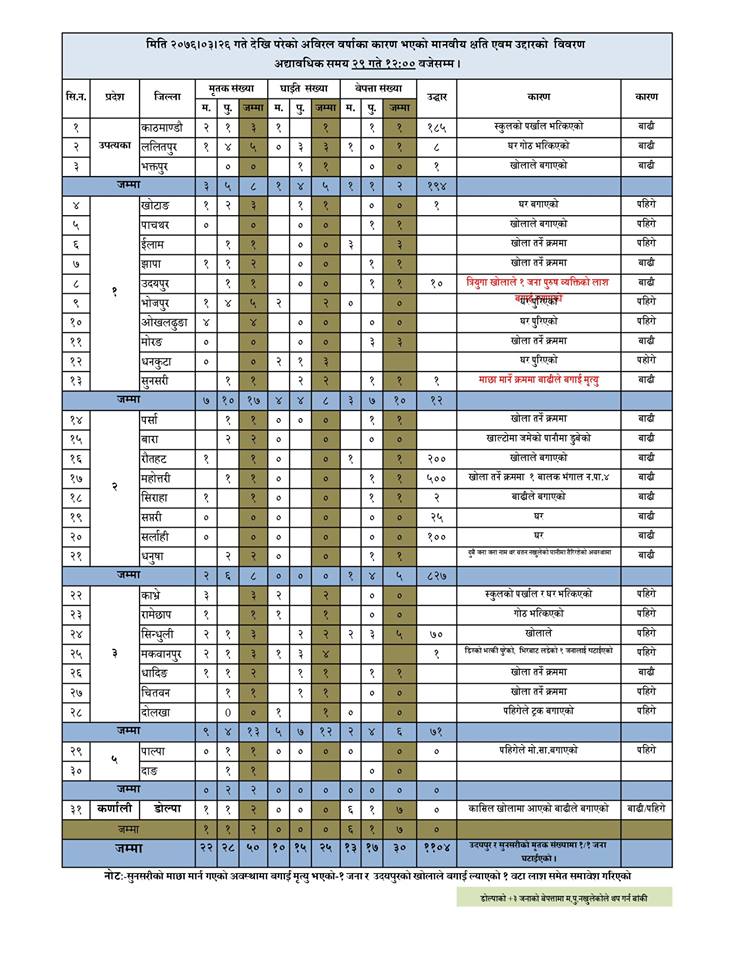 बिहानसम्मको तथ्याकंअनुसार काठमाडौंमा ३, ललितपुरमा ५, खोटाङमा ३, इलामामा १, झापामा २, उदयपुरमा १, भोजपुरमा ५, ओखलढुंगामा ४, सुनसरीमा १, पर्सामा १, बारामा २, रौतहटमा १, सिराहामा १, धनुषामा २, काभ्रेमा ३, रामेछापमा १, सिन्धुलीमा २, मकवानपुरमा ३, धादिङमा २, चितवनमा १, पाल्पामा १, दाङमा १ र डोल्पामा २ जनाले ज्यान गुमाएका छन्।