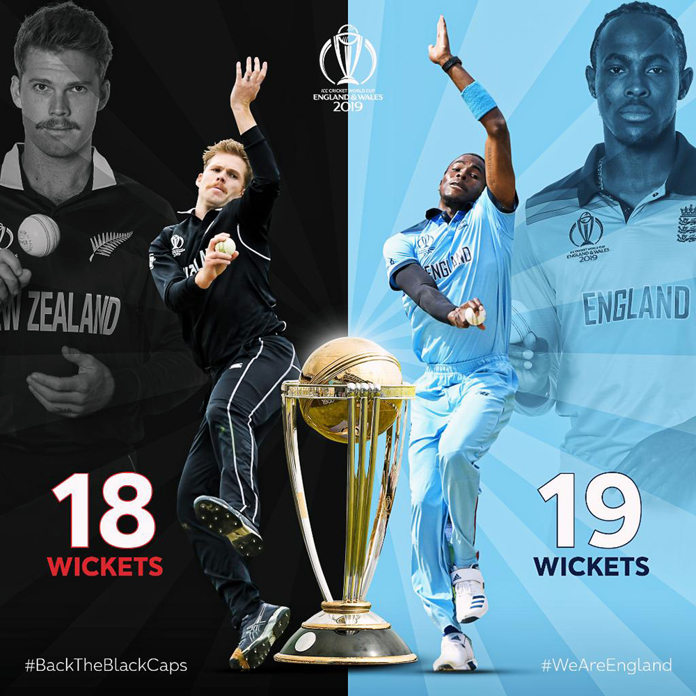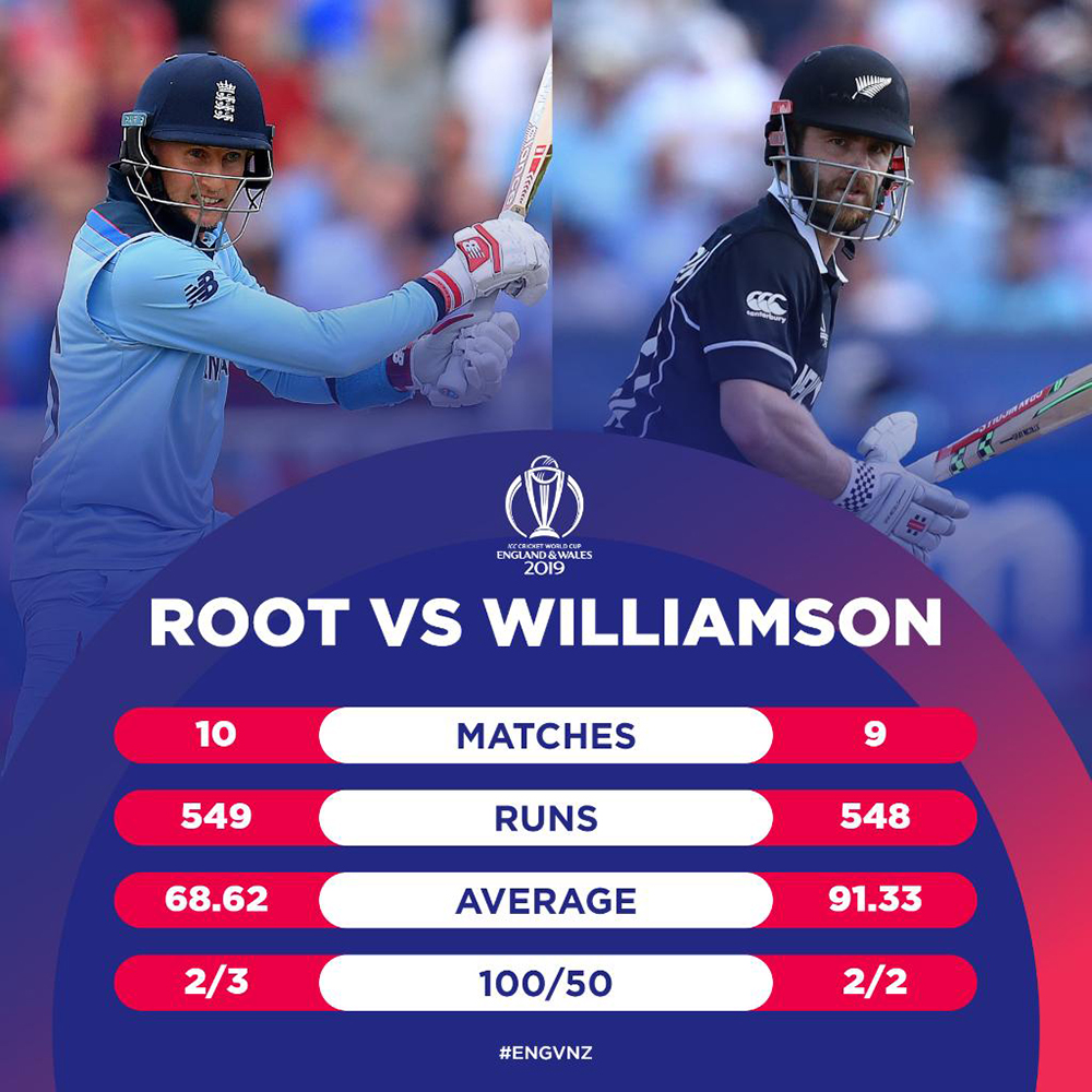 त्यसमाथि फाइनलमा न्युजिल्यान्ड कप्तान विलियम्सन र इंग्ल्यान्डका जो रुट एक विश्वकपमा सबैभन्दा बढी रन बनाउने किर्तिमान भंग गर्ने संघारमा छन्। सन् २००३ को विश्वकपमा 'मास्टर ब्लास्टर' सचिन तेन्दुलकरले बनाएको ६ सय ७३ रनको रेकर्ड तोड्न विलियम्सन र रुट क्रमशः १ सय २६ र १ सय २५ रन पछाडि छन्। यसकारण पनि फाइनलमा यी दुवैको प्रदर्शनमा सबैको नजर रहन्छ।