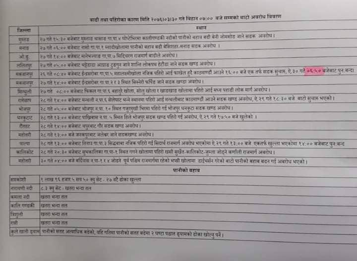 बाढी र पहिरोका कारण देशभरका विभिन्न सडकखण्डमा क्षति पुगेको छ। जसका कारण कतिपय सडकखण्ड सञ्चालनमा आए पनि कतिपय भने अझै सूचारु हुन सकेका छैनन्। जसका कारण यात्रुलाई समस्या थपिएको छ।