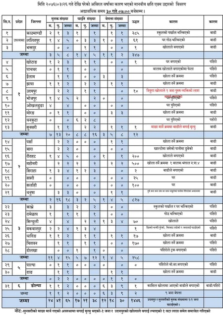 बाढी तथा पहिरोमा परी ३० जना अझै बेपत्ता छन्। विभिन्न जिल्लामा गरी १२ महिला र १८ पुरुष हराइरहेको प्रहरीले जनाएको छ।