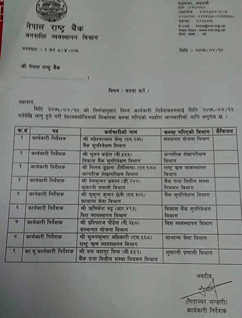 जिम्मेवारी हेरफेर भएका कार्यकारी निर्देशकको सूची यस्तो छ-