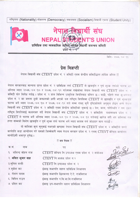 नाराबाजी गर्दै जनकपुरको रामनानद चौकस्थित प्रदेश कार्यालय पुगेका विद्यार्थीले असार अन्तिम साता वर्षासँगै आएको बाढी, पहिरो र डुबानका कारण प्रदेश २ का ८ जिल्ला प्रभावित भएको बेला यस क्षेत्रका थुप्रै विद्यार्थी आवेदन दिनबाट बञ्चित हुनु परेकोकाले थप समय माग गर्दै तालाबन्दी गरिएको नेविसंघ प्रदेश २ का संयोजक शशिन्द्र मोहन राजले बताएका छन्।