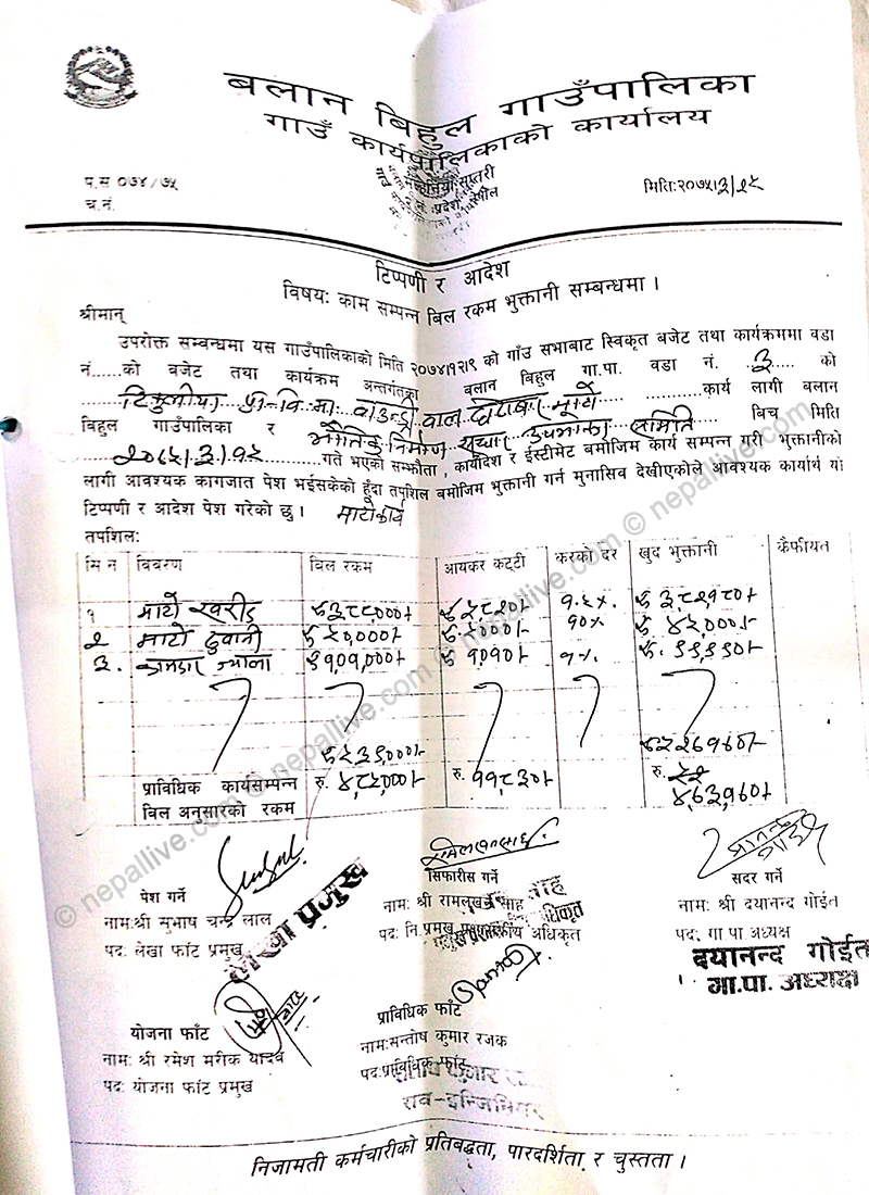 प्राविधिक मूल्यांकन ४ लाख ८५ हजारमा ११ हजार ८ सय ३० रुपैयाँ आयकर कट्टी गरी गाउँपालिकाले असार २५ गते ४ लाख ७३ हजार १७० रुपैयाँ भुक्तानी गरेको छ।