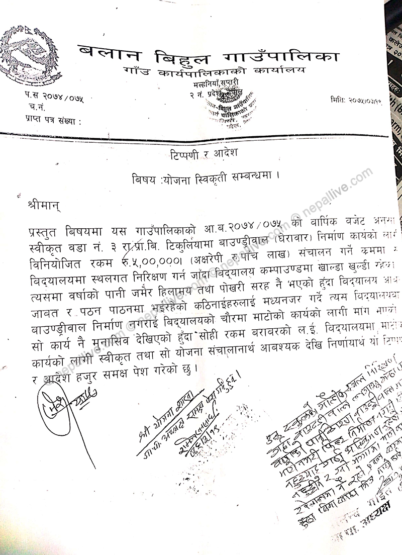 असार १९ गते योजना शाखामार्फत टिप्पणी उठाएर सोही मितिमा अध्यक्ष दयानन्द गोइतले योजना स्विकृत गरी कार्यादेश दिएका छन्। हरिलाल साहको अध्यक्षतामा गठित उपभोक्ता समितिले विद्यालयमा माटो भरेर कुल ५ लाख ३९ हजारको बिल भरपाई पेस गरेको छ।