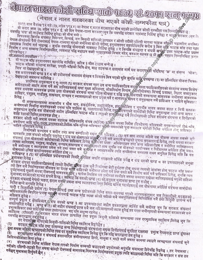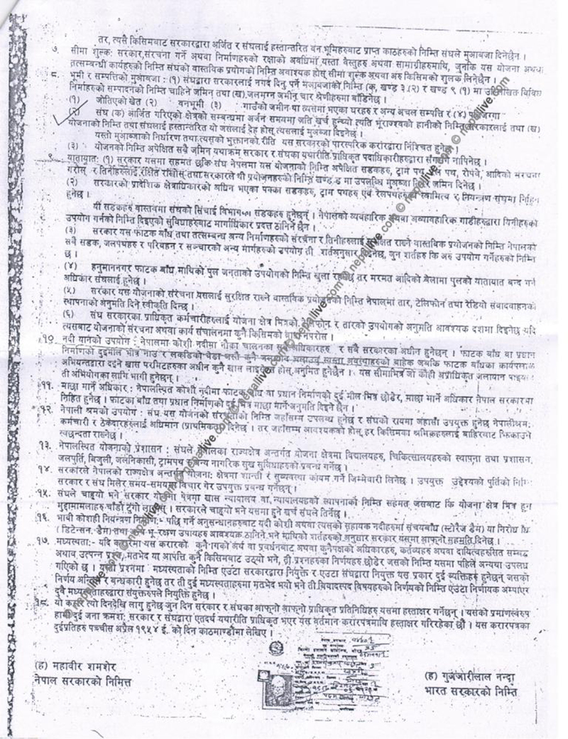 २०११ साल वैशाख १२ गते (२५ अप्रिल १९५४) पुल र बाँध निर्माणका लागि नेपाल-भारतबीच १ सय ९९ वर्षे सम्झौता भएको थियो। नेपाल सरकारको तर्फबाट योजना, विकास तथा भूमिसुधार मन्त्री महावीर शमशेर र भारतको तर्फबाट योजनामन्त्री गुलजारीलाल नन्दाले सो सम्झौतामा हस्ताक्षर गरेका छन्।