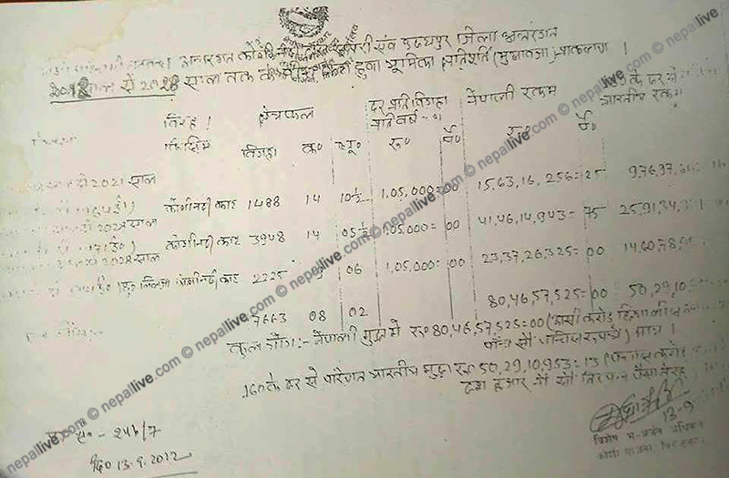 सप्तरीका तत्कालीन सिडिओ हरिराज पन्तको अध्यक्षतामा बसेको बैठकले कोसी योजनाअन्तर्गत कटान भएको ७ हजार ६ सय ६३ बिघा ८ कठ्ठा २ धुर जग्गाको लगत संकलन गरेको थियो। सोही बमोजिम सो समितिले ८० करोड ४६ लाख ५७ हजार ५ सय २५ रुपैयाँ १३ पैसा मुआब्जा उपलब्ध गराउन सिफारिस गरेको थियो। मुआब्जा मूल्यांकनका क्रममा उदयपुरका तत्कालीन सिडिओ प्रेमप्रसाद लुईंटेलसहितको टोली, सम्पर्क तथा भूआर्जन कार्यालय विराटनगरका भूआर्जन अधिकृत नन्दबहादुर राईसहितको टोली तथा सप्तरीका कार्यालय प्रमुखहरुको समेत उपस्थिति थियो।