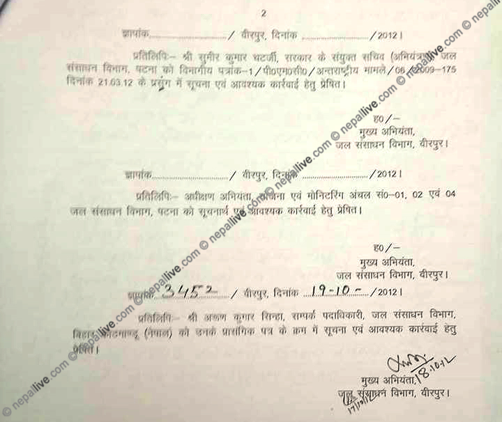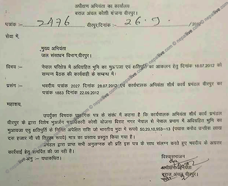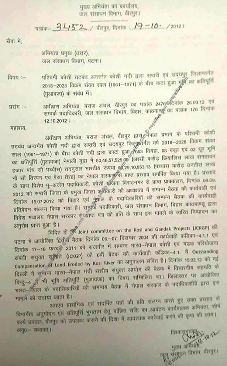 सोही पत्रका आधारमा अधिक्षण अभियन्ता कार्यालय विरपुरले सन् २०१२ सेप्टेम्बर २६ मा जल संसाधन विभाग पटनाका मुख्य अभियन्तालाई पत्राचार गरी मुआब्जाको लागि सिफारिस गरिसकेको छ।