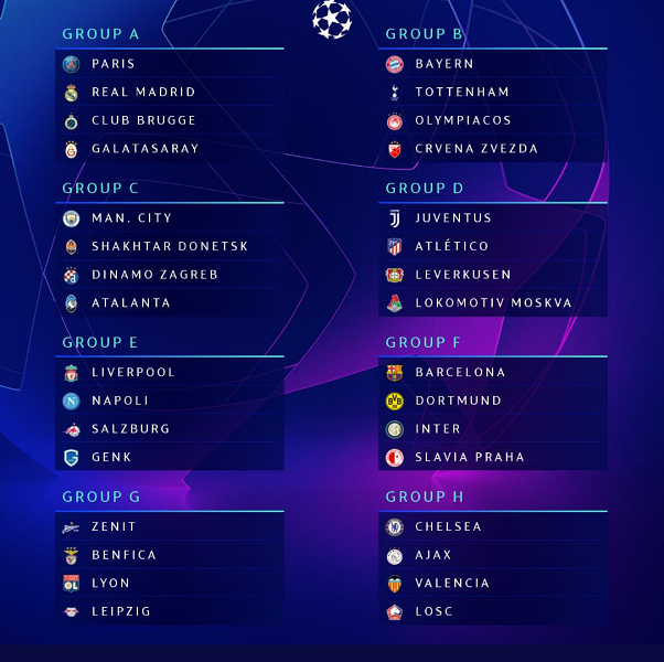 यस सिजन सन् २०१९/२०को च्याम्पियन्स लिगको सार्वजनिक भएको ड्र अनुसार साविक विजेता लिभरपुल नपोली, साल्जबर्ग र गियांकसँग एउटै समूहमा परेका छन्।