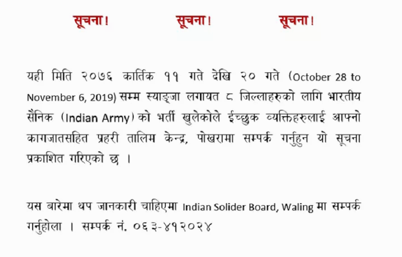 स्याङ्जा- स्याङ्जास्थित वालिङ नगरपालिकाले भारतीय सेनामा भर्तीका लागि प्रोत्साहन हुने गरी सूचना प्रकाशन गरेको छ। बिहीबार नगरपालिकाको फेसबुक पेजमा त्यस्तो सूचना जारी गरेको हो।