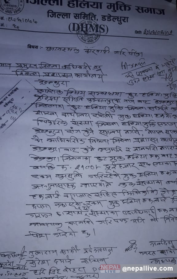 यस्तो गतिविधि रोक्न भन्दै जिल्ला हलिया मुक्ति समाजले जिल्ला प्रशासन कार्यालय डडेल्धुरालाई कारबाहीका लागि पत्रसमेत लेखेको थियो। उक्त पत्रमा छुट हलिया मुक्ति केन्द्रीय समिति कञ्चनपुरका नामबाट डडेल्धुरा जिल्लामा छुट हलिया मुक्ति जिल्ला समिति शाखा कार्यालय खोलेर मुक्त हलियाहरुको आधिकारिक संस्था जिल्ला हलिया मुक्ति समाज डडेल्धुरासँग कुनै समन्वय नभएको उल्लेख छ।