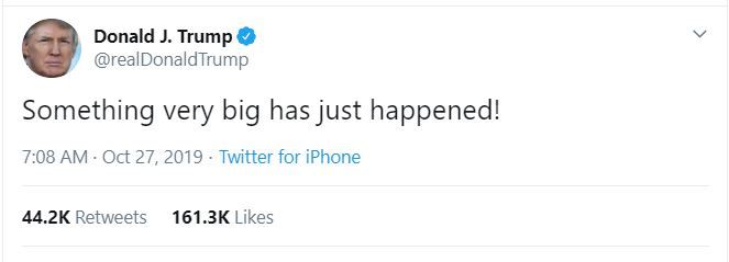 बग्दादी नै मारिएको यकिन गर्न डिएनए टेस्ट बाँकी रहेको बुझिएको छ। यही हल्लालाई बैधानिकता दिने तरिकाले अमेरिकी राष्ट्रपति डोनाल्ड ट्रम्पले ट्वीट गरेका छन्। उनले ट्वीटमा लेखेका छन् 'केही ठूलो घटना घटेको छ।'
