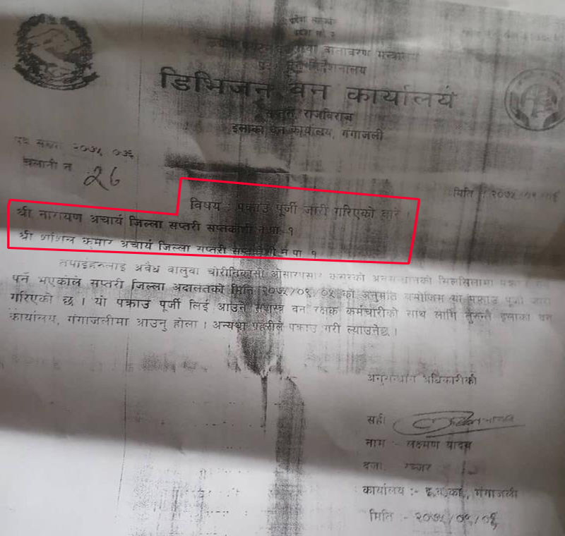 यसैगरी, वन पैदावार हानी–नोक्सानी गरेको आरोपमा सप्तकोशी नगरपालिका–१ का वडाअध्यक्ष नारायण आचार्यविरुद्ध करिब १ वर्ष अघि नै डिभिजन वन कार्यालय राजविराजले पक्राउ पुर्जी जारी गरेको थियो।