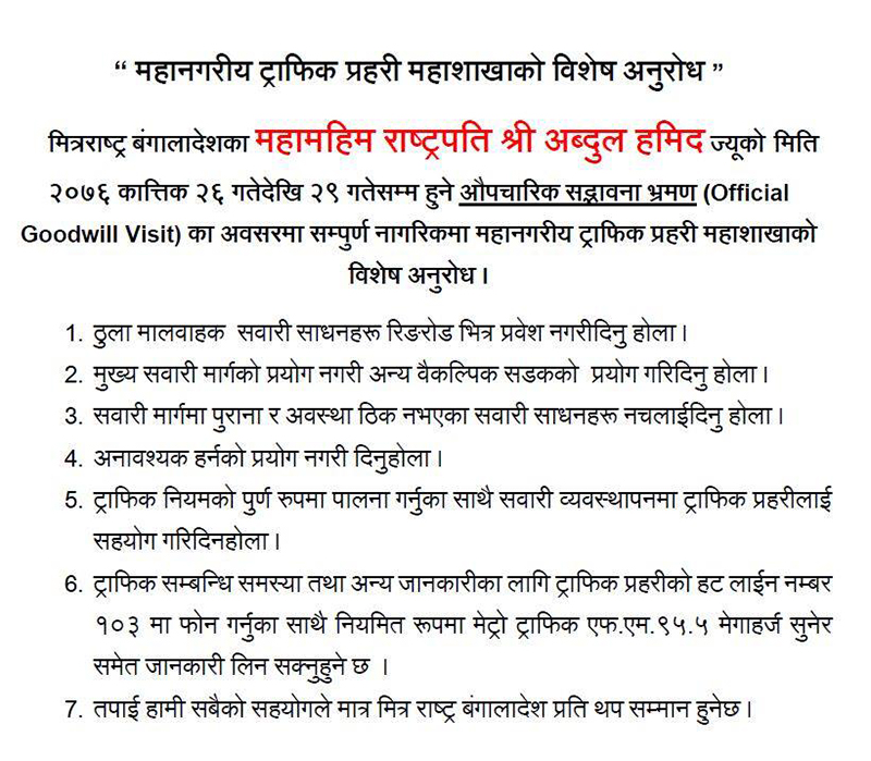 त्यस्तै अनावश्यक हर्न नबजाउन, ट्राफिक नियम पालना गर्न र ट्राफिकसम्बन्धी केही समस्या परे खबर गर्न अनुरोध गरेको छ। राष्ट्रपति हमिदलाई त्रिभुवन अन्तर्राष्ट्रिय विमानस्थलमा औपचारिक स्वागत गरिने परराष्ट्र मन्त्रालयले जनाएको छ।