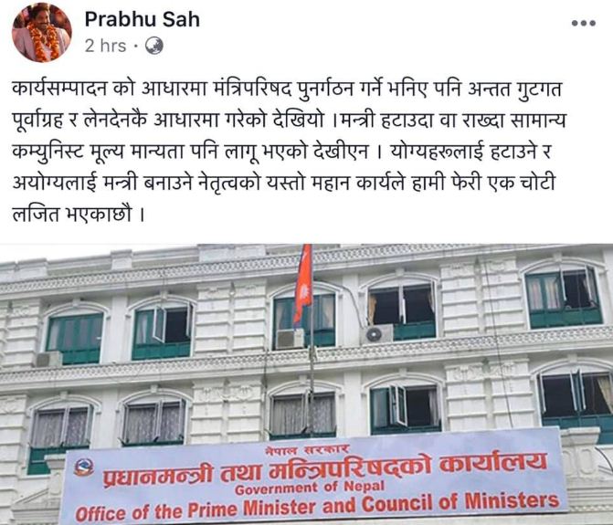 काठमाडौं- नेकपा केन्द्रीय प्रभु साहले प्रधानमन्त्री केपी शर्मा ओलीले मन्त्रिपरिषद् पुनर्गठन गरेको प्रति असन्तुष्टि पोखेर सामाजिक सञ्जालमा लेखे। साहले कार्यसम्पादनको आधारमा गर्ने भनिएपनि गुट, लेनदेन र पूर्वाग्रहका आधारमा मन्त्रिपरिषद पुनर्गठन गरिएको भन्दै प्रधानमन्त्रीको आलोचना गरे। उनको आलोचनात्मक टिप्पणी लगत्तै नेकपाका अर्का नेता विष्णु रिजालले साहलाई जवाफ फर्काएका छन्। विदेश विभाग उपप्रमुखसमेत रहेका रिजालले काशी तिवारी हत्याकाण्डको फाइल पनि खुल्न लागेको हो र भन्दै प्रश्न गरेका छन्।