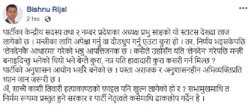 रिजालले पार्टीको अनुशासन आयोग भर्खरै बनेको पनि साहलाई सम्झाउन प्रयास गरेका छन्। यस्ता अराजक र अनुशासनहीन अभिव्यक्तिप्रति ध्यान जान जरूरी भएको उनले फेसवुकमा लेखेका छन्।