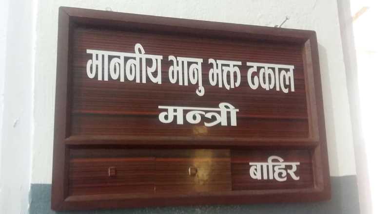 मन्त्रीको नेमप्लेटमा निर्वतमान कानुनमन्त्री ढकालकै नाम थियो। नेमप्लेट पुरानै टाँसिएको थियो। पुरानो नेम प्लेटमा भएका भानुभक्त ढकाल कार्यकक्ष बाहिर भएको उल्लेख गरिएको थियो।