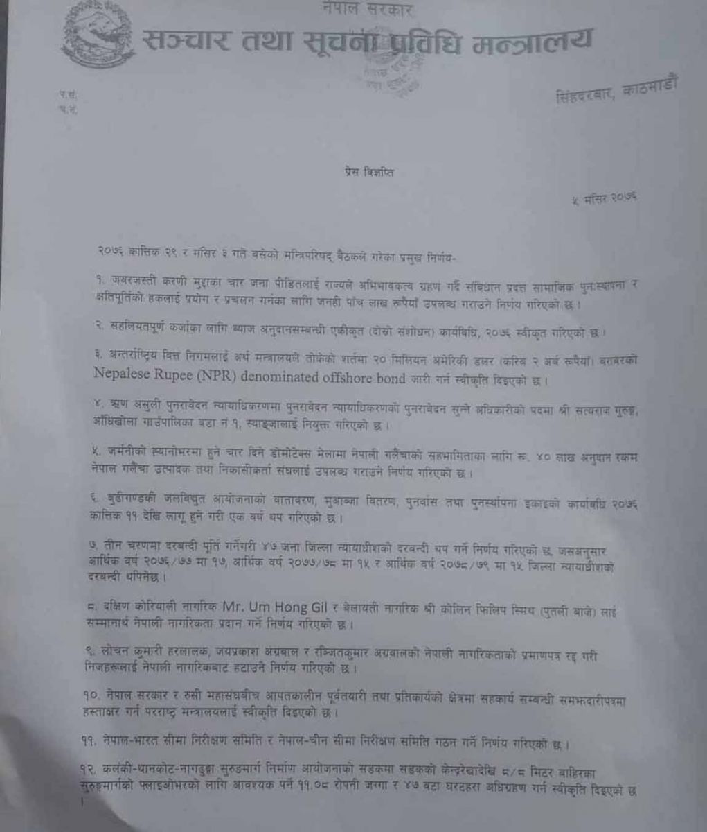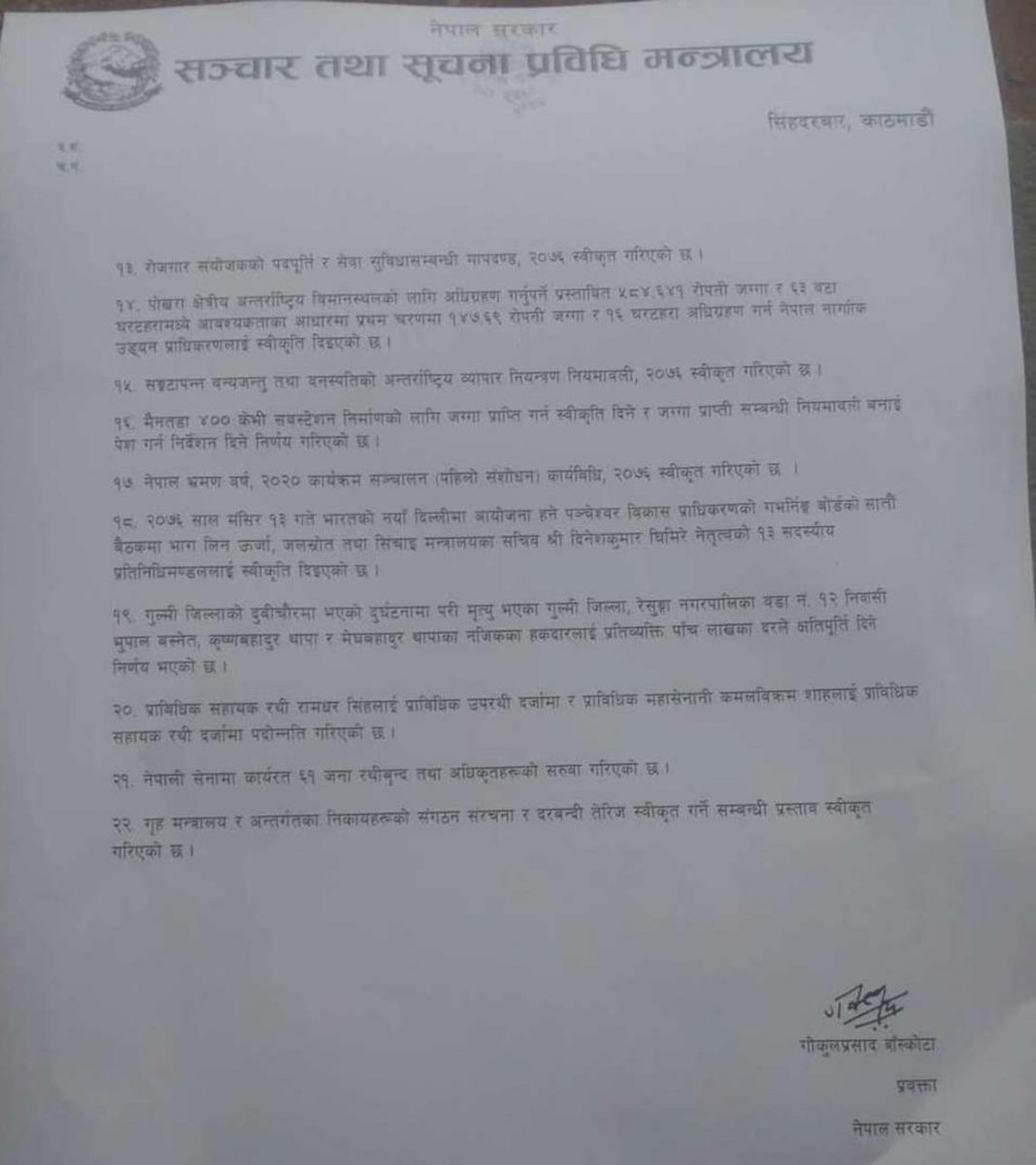 यस्ता छन्, मन्त्रिपरिषद्को निर्णयहरुः