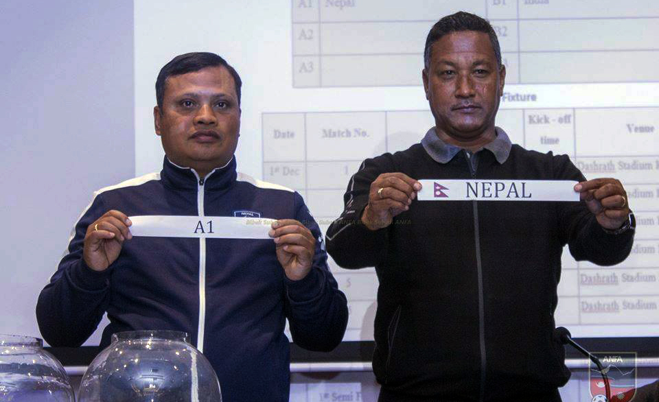 अखिल नेपाल फुटबल संघ (एन्फा) ले आज ‘ड्र’ सार्वजनिक गरेको हो। डिफेन्डिङ च्याम्पियन नेपाल रहेको समूह ‘ए’ मा बंगलादेश र भुटान रहेका छन्। तुलनात्मक रुपले नेपाल सजिलो समूहमा परेको हो। त्यस्तै, समूह ‘बी’ मा भारत, माल्दिभ्स र श्रीलंका रहेका छन्।