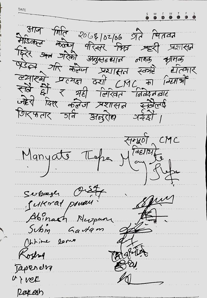 ‘कलेज परिसरभित्र प्रहरी छिरेर गरेको अनुसन्धान नामक भ्रामक षड्यन्त्र गरि कलेज प्रशासन स्वयंले हतियार ल्याएको कलेजका विद्यार्थी सबै प्रत्यक्षदर्शी छौं,’ विद्यार्थीद्वारा जारी विज्ञप्तिमा भनिएको छ, ‘विद्यार्थीले कलेज प्रशासनका सबैलाई गिरफ्तार गर्न पनि माग गरेका छन्।’