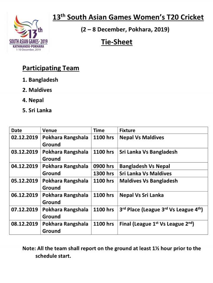 नेपालले पोखरा मैदानमा मंसिर १६ गते माल्दिभ्ससँग खेल्नेछ। महिला क्रिकेटमा अयोजक नेपालसँगै माल्दिभ्स, श्रीलंका र बंगलादेश रहेको छ।