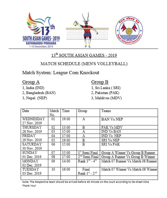 पुरुष भलिबलको पहिलो खेलमा बुधबार बेलुका ७ बजे नेपाल र बंगलादेशबीच खेल हुँदैछ। दोस्रो खेल शुक्रबार बेलुका ५ बजे नेपाल र भारतबीच हुनेछ।
