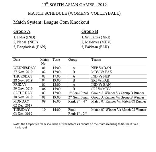 महिला भलिबलमा बुधबार दिउँसो ३ बजे नेपाल र बंगलादेशबीच खेल हुनेछ। दोस्रो खेल बिहीबार बेलुका ५ बजे नेपाल र भारतबीच हुनेछ।
