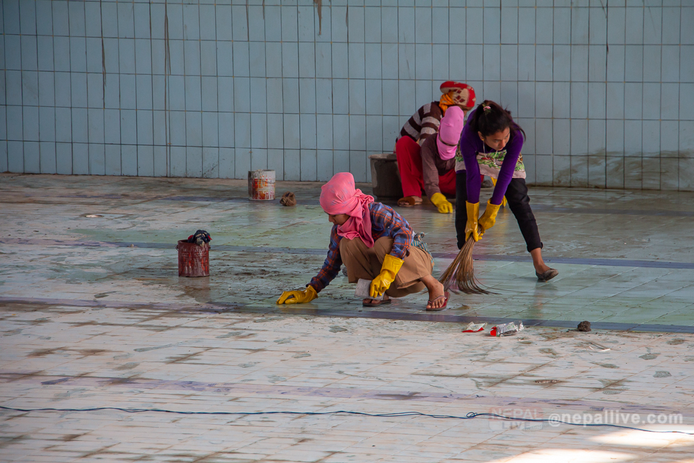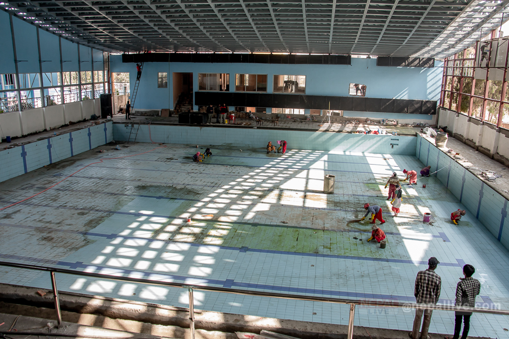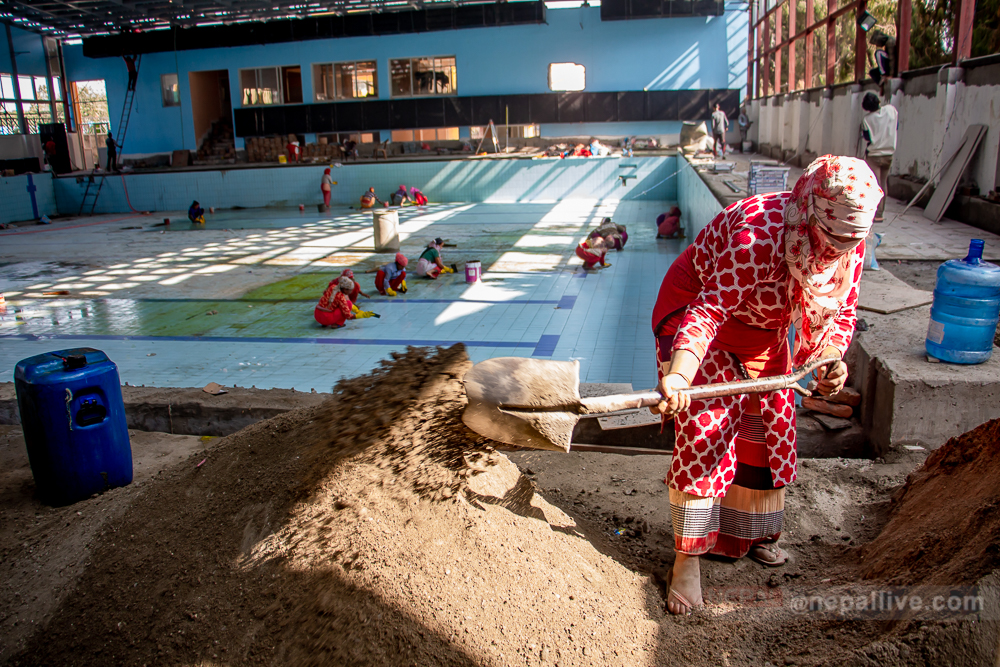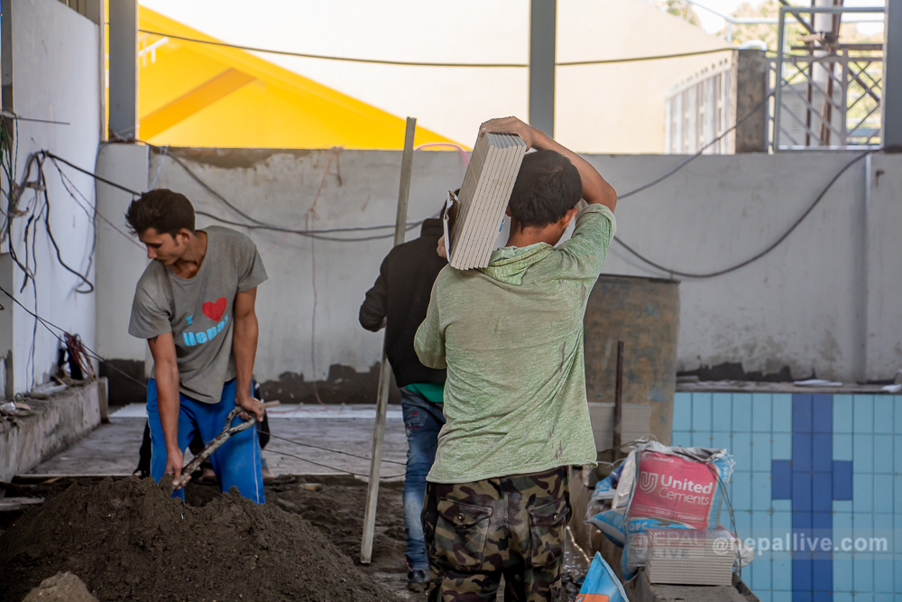 स्वीमिङ पुलको डिलमा टायल हाल्ने काम धमाधम भइरहेको छ भने पश्चिमपट्टी निर्माण भएको भवनमा प्याराफिट बनाउने काम पनि चलिरहेको छ।