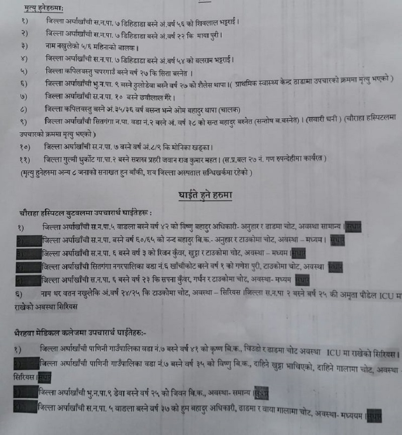 अर्घाखाँची- अर्घाखाँचीको नरपानीमा भएको बस दुर्घटनामा परी मृत्यु हुनेको संख्या १९ पुगेको छ। मृतक मध्ये ११ जनाकाे सनाखत भएकाे छ। ८ जनाकाे सनाखत हुन बाँकी छ।