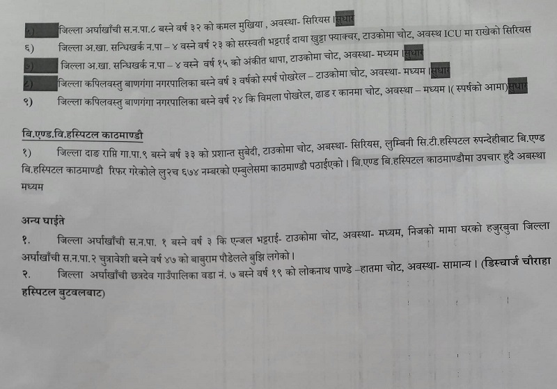 बस दुर्घटनामा परी घाइते भएका मध्ये ९ जनाकाे भैरहवा मेडिकल कलेज, ६ जनाकाे चाैराह हस्पिटल बुटवल र १ जनाकाे बि एण्ड बि हस्पिटल काठमाडाैंमा उपचार भइरेहाे छ।