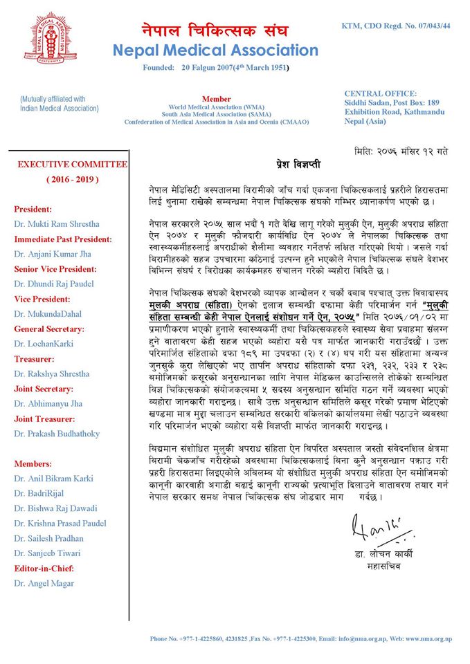 संघले मुलुकी अपराध संहिता ऐन र मुलुकी फौजदारी कार्यविधि अनुसार अनुसन्धान नगरी सोझै डाक्टर पक्राउ गरेकोमा विरोध जनाएको हो। संघले मुलुकी संहितामा भएको व्यवस्था अनुसार अनुसन्धान अगाडि बढाउन पनि माग गरेको छ।