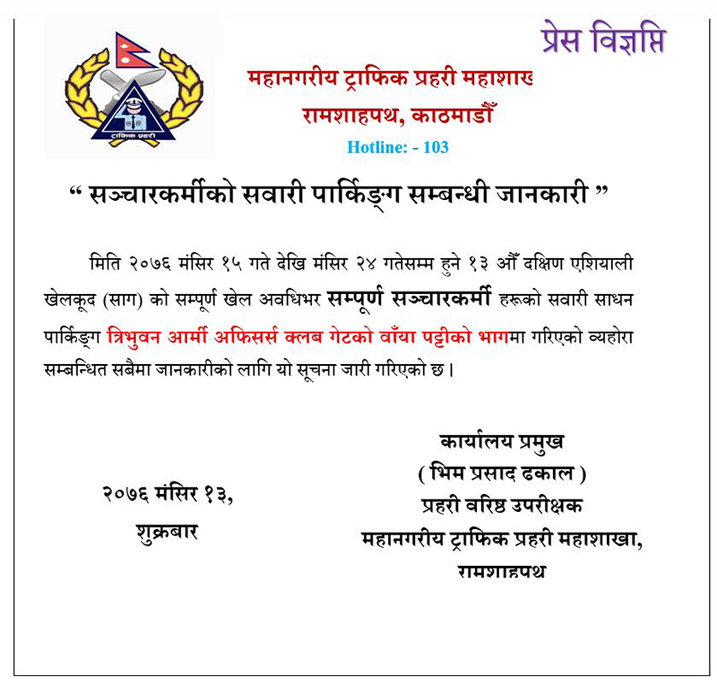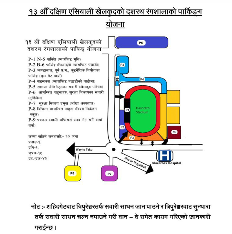 काठमाडाैं- १३औं दक्षिण एसियाली खेलकुद प्रतियोगिता (साग)को खेल अवधिभर सञ्चारकर्मीका लागि सवारीसाधान पार्किङको व्यवस्था गरिएकाे छ। त्रिभुवन आर्मी अफिसर्स क्लबमा सवारीसाधान पार्किङकाे व्यवस्था गरिएको महानगरीय ट्राफिक प्रहरी महाशाखाले जनाएको छ।