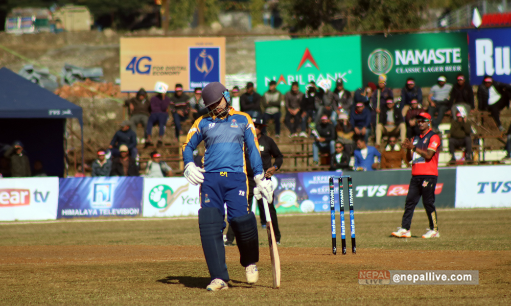 कप्तान ज्ञानेन्द्र मल्ल १५ बलमा १५ रन बनाउँदा आउट भए। सुवोध भाटी दुई बल खेलेर बिनारन आउट भए। आदिल खान १५ बलमा २३ रन बनाउँदा आउट भए।