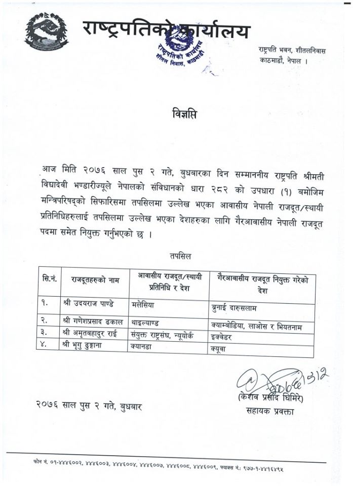 राष्ट्रपति कार्यालयका अनुसार राष्ट्रपति भण्डारीले मलेसियाका लागि नेपाली राजदूत उदयराज पाण्डेलाई ब्रुनाई, थाइल्यान्डका राजदूत गणेशप्रसाद ढकाललाई कम्बोडिया, लाओस र भियतनाम, राष्ट्रसंघका लागि आवासीय प्रतिनिधि अमृतबहादुर राईलाई इक्वेडर र क्यानाडाका लागि राजदूत भृगु ढुंगानालाई क्युबाको गैरआवासीय राजदूतमा नियुक्त गरेकी हुन्।