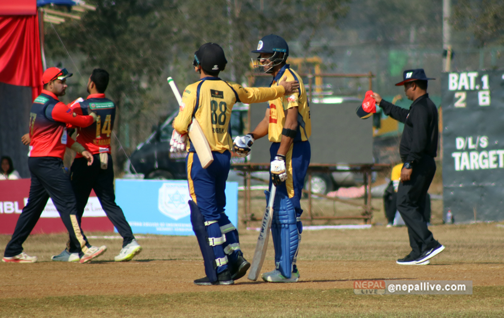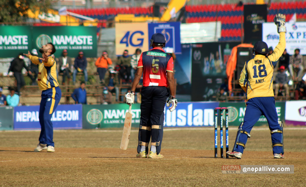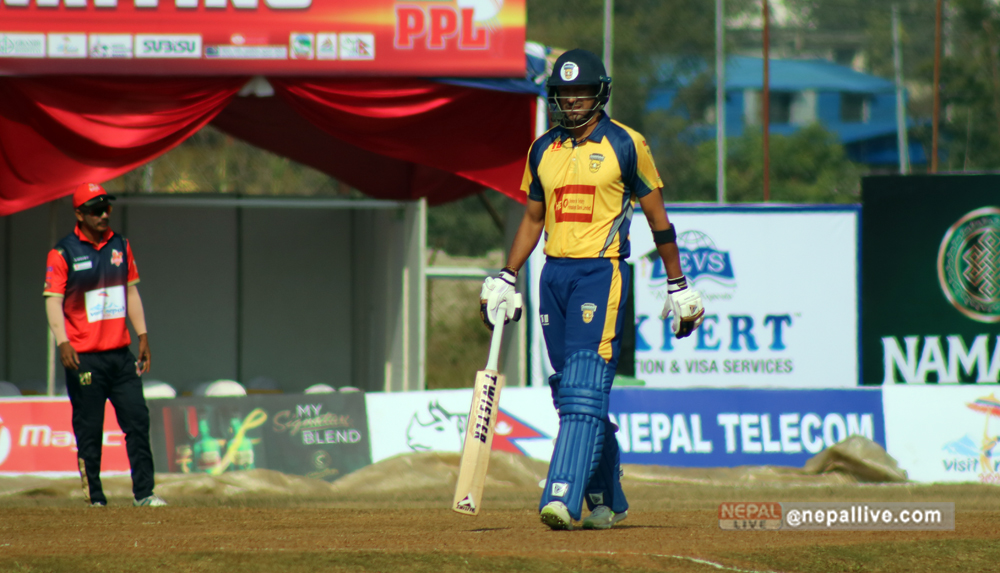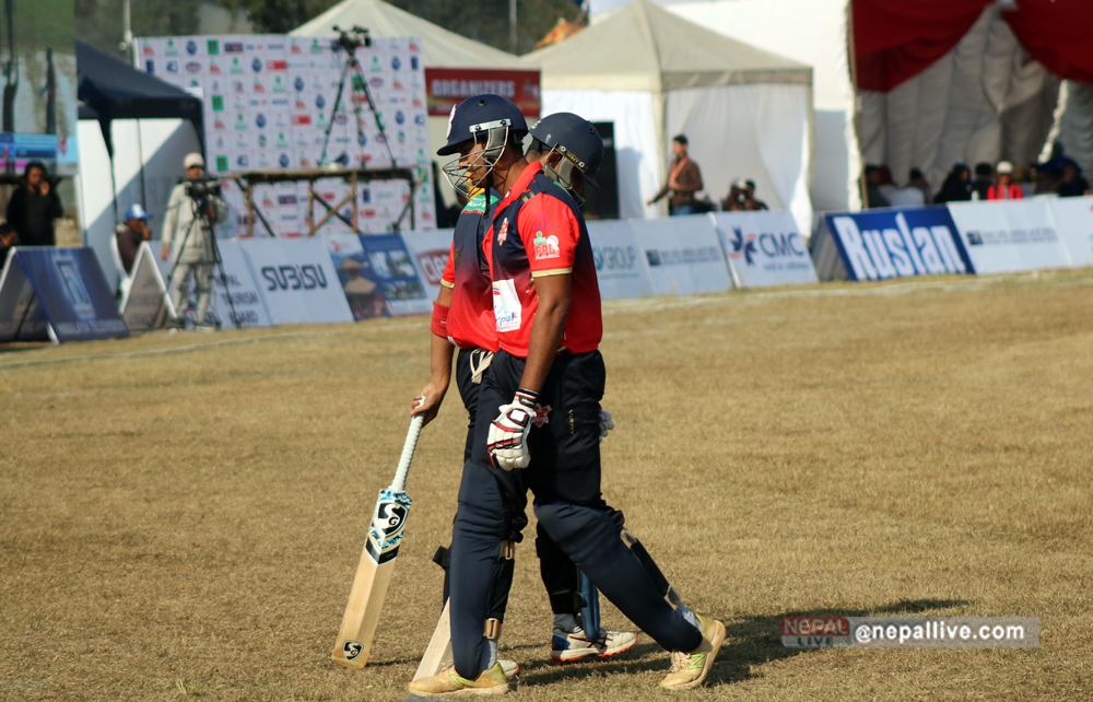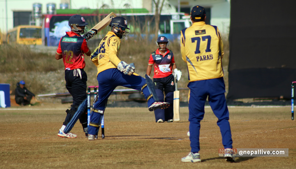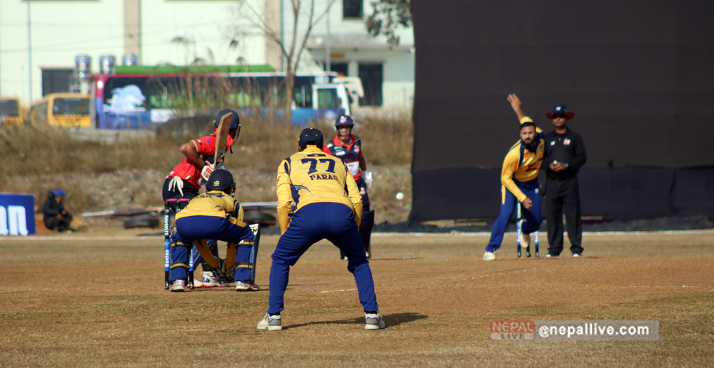 पारस आउट भएपछि आएका बाबर हयातले ५ बलमा १ रन मात्रै बनाए। उनी अफ्ताबुद्धिनकै बलमा बोल्डआउट भएका थिए। आरिफ शेखले १९ बलमा ४० रन बनाए। उनले ३ चौका ३ छक्का हाने। बुटवलका अफ्ताबुद्धिन अहमदले दुई साथै अभिनाश बोहराले एक विकेट लिए।