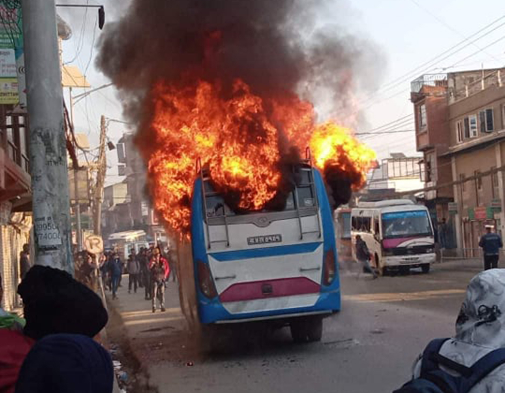 विद्यार्थीहरुले बा ४ ख ७१०१ नम्बरको बसमा आगजनी गरेका थिए भने बा ३ ख ४४३३ नम्बरको बसका सिसा तोडफोड गरिदिएका छन्। अहिले पनि अवस्था भने तनावग्रस्त छ।