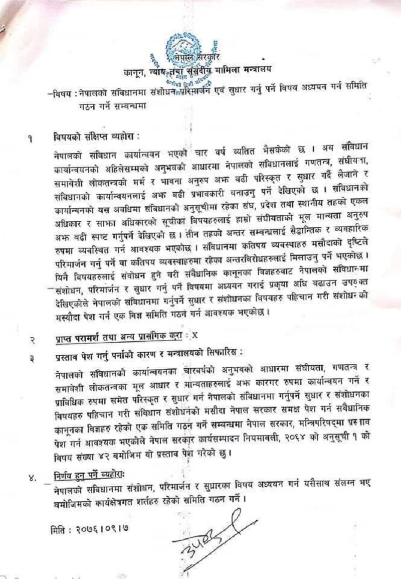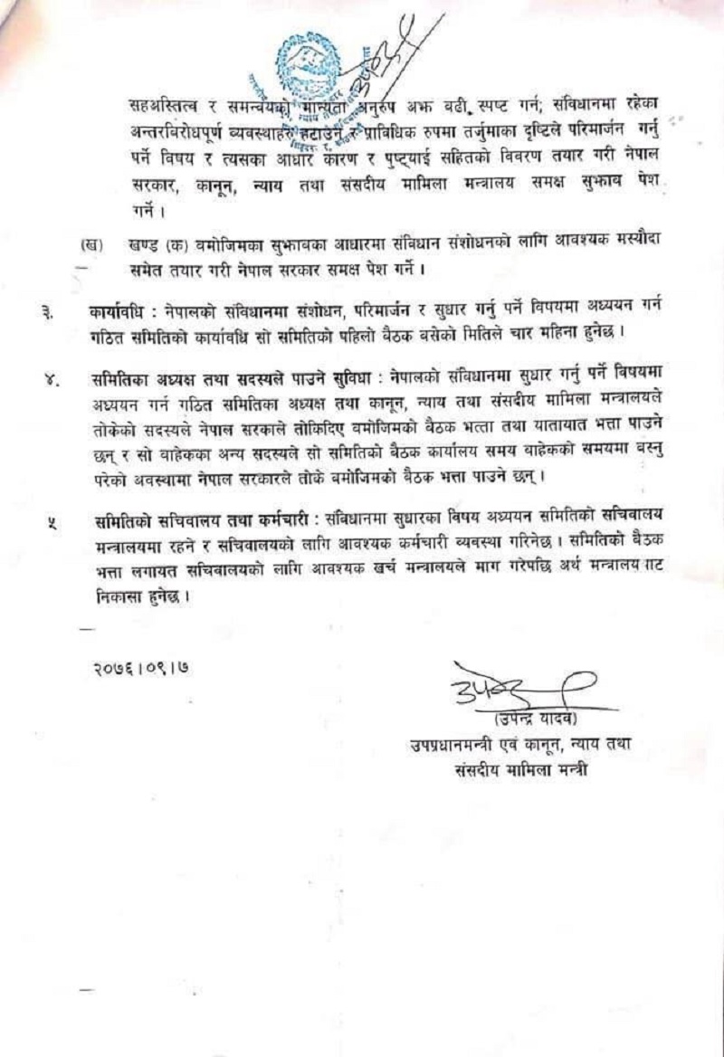 काठमाडौं– समाजवादी पार्टी नेपालका अध्यक्ष एवं कानुनमन्त्री उपेन्द्र यादवले संविधान संशोधनका लागि मन्त्रिपरिषद् बैठकमा लगेको प्रस्ताव सार्वजकि भएको छ।