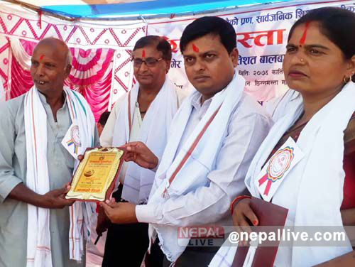 ०७६ कात्तिक १ गते छिन्नमस्ता गाउँपालिकालाई शतप्रतिशत बालबालिका विद्यालय भर्ना भएको गाउँपालिका घोषणा गर्दै जिल्ला समन्वय समिति सप्तरीका संयोजक प्रभाकर यादव (दायाँबाट दोस्रो) र छिन्नमस्ता गाउँपालिकाका अध्यक्ष सूर्यनारायण यादव ‘कुडुर’ (बायाँबाट पहिलो)