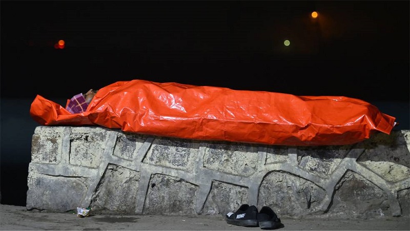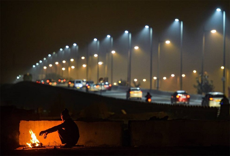 दिल्लीमा चिसाेबाट बच्नका लागि प्लास्टिककाे ओडेर सुत्दै