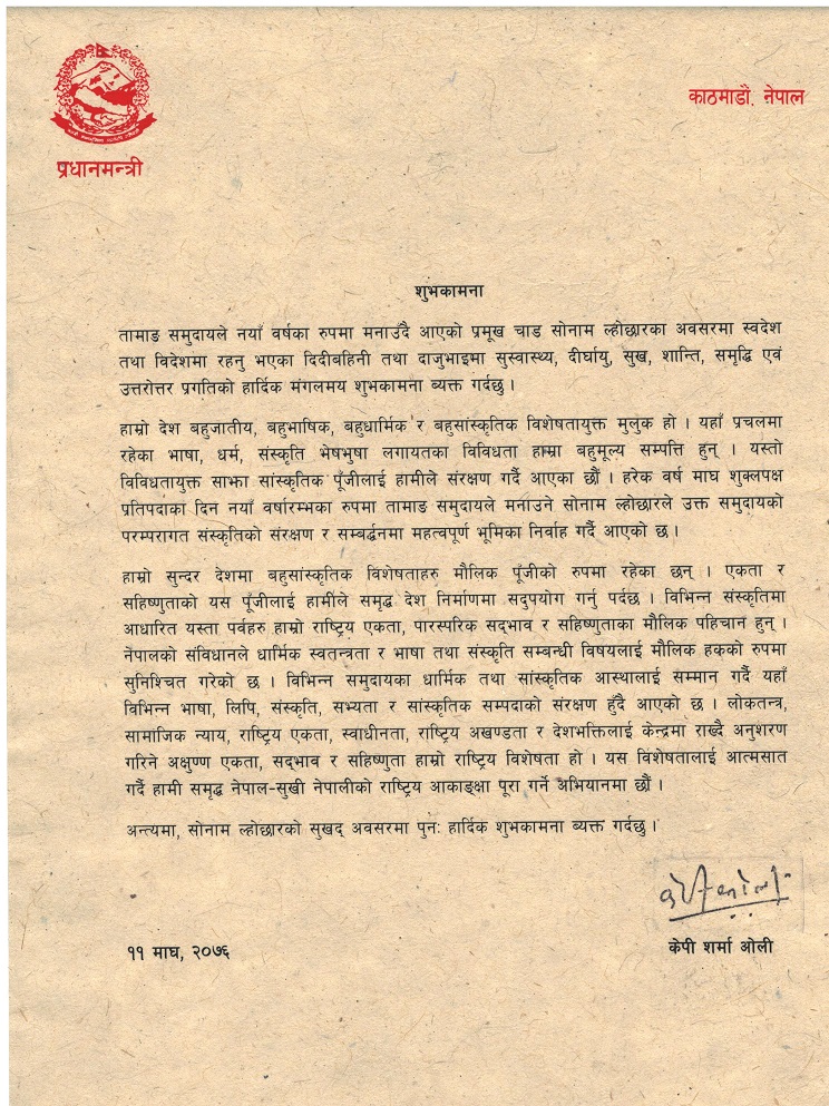 उनले लोकतन्त्र, सामाजिक न्याय, राष्ट्रिय एकता, स्वाधीनता र देशभक्तिलाई केन्द्रमा राख्दै अनुसरण गरिने अक्षुण्ण एकता, सद्भाव र सहिष्णुता हाम्रो विशेषता भएकाे बताएका छन्। प्रधानमन्त्रीले ओलीले सोनाम ल्होछारका अवसरमा स्वदेश तथा विदेशमा रहनुभएका दिदीबहिनी तथा दाजुभाइमा सुस्वास्थ्य, दीर्घायु, सुख, शान्ति, समृद्धि एंव उत्तररोत्तर प्रगतिको हार्दिक मङ्गलमय शुभकामना व्यक्त गर्दै सरकार समृद्ध नेपाल–सुखी नेपालको राष्ट्रिय आकाङ्क्षा पूरा गर्ने अभियानमा रहेको बताए।