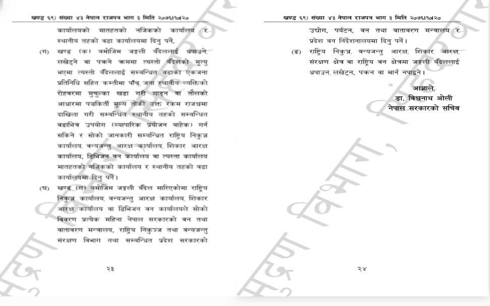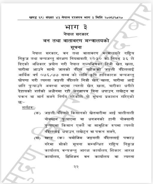 काठमाडौं- सरकारले चालु आर्थिक वर्ष २०७६/७७ अर्थात् अबको ५ महिना अवधिमा जंगली जनावर बिनाअनुमति मार्न, धपाउन वा पक्रन पाइने भन्दै राजपत्रमा सुचना प्रकाशित गरेको छ।