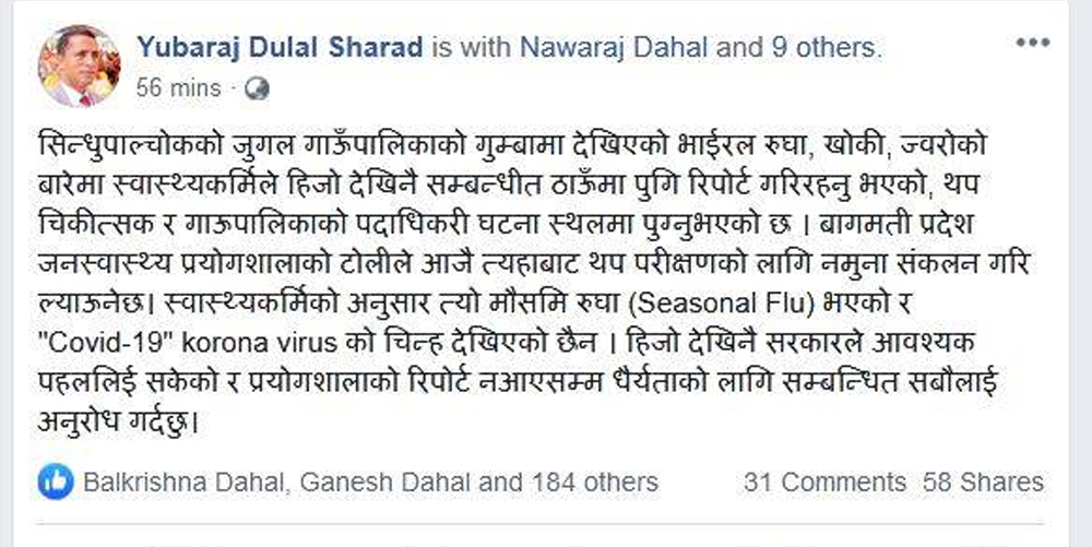 उनले भने, ‘सिन्धुपाल्चोकमा देखिएको बिरामीमा कोरोना होइन, मौसमी रुघाखोकी हो। गलत सन्देशले भ्रम मात्र फैलियो।’ बिरामीको उपचार र रोगबारे अध्ययनका लागि जिल्ला स्वास्थ्य कार्यालय सिन्धुपाल्चाकको टोलीलाई खटाइएको उनले बताए।