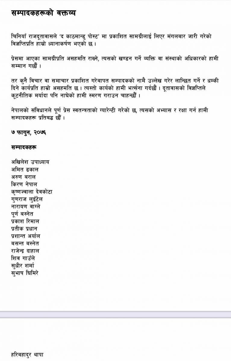 काठमाडौं– ‘द काठमान्डु पोष्ट’ दैनिकमा प्रकाशित एउटा लेखबारे काठमाडौंस्थित चिनियाँ दूतावासले मंगलबार जारी गरेको विज्ञप्तिको सम्पादकहरूले भत्सर्ना गरेका छन्।