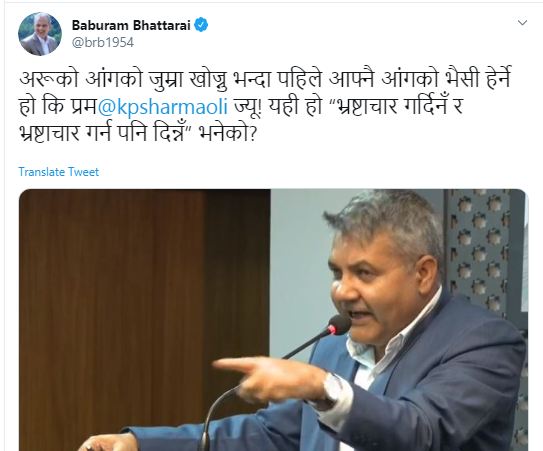 उनले प्रधानमन्त्री केपी ओलीलाई मेन्सन गर्दै ट्वीट गरेका छन्, ‘अरुको आङको जुम्रा खोज्नुभन्दा पहिले आफ्नै आङको भैंसी हेर्ने हो कि प्रम केपी शर्मा ओलीज्यु, यही हो भ्रष्टाचार गर्दिनँ र भ्रष्टाचार गर्न पनि दिन्नँ भनेको ?’