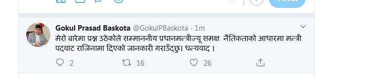 ट्वीटमा उनले‚ ‘मेरो बारेमा प्रश्न उठेकोले सम्माननीय प्रधानमन्त्रीज्यू समक्ष नैतिकताको आधारमा मन्त्री पदबाट राजिनामा दिएको जानकारी गराउँदछु।’ भन्दै औपचारिक रुपमा राजिनामा दिएको सार्वजनिक गरेका हुन्।