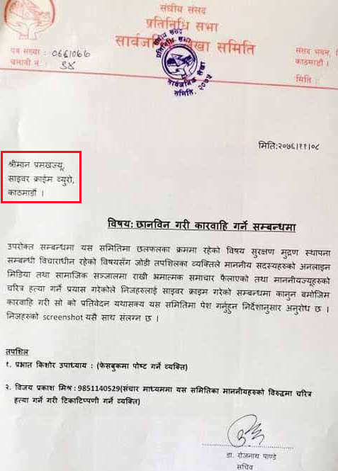 समितिले प्रहरीको 'साइबर क्राइम ब्युरो'लाई पत्र पठाएको छ। तर प्रहरीमा त्यस्तो कुनै ब्युरो नै छैन। केन्द्रीय साइबर ब्युरो मात्र छ।