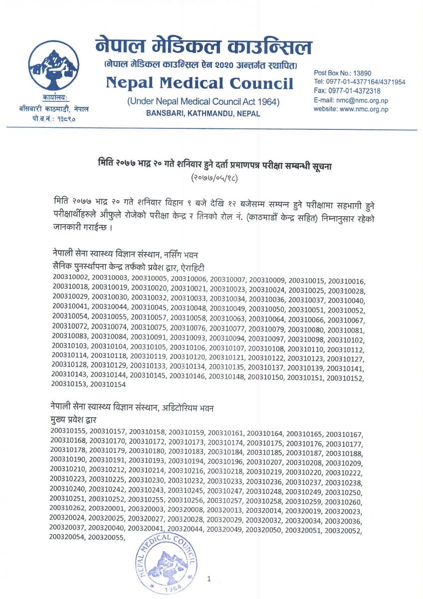 काउन्सिलले नेपाली सेना स्वास्थ्य विज्ञान संस्थान नर्सिङ भवन र अडिटोरियम भवनमा, काठमाडौं मेडिकल कलेज बेसिक साइन्स भवन दुवाकोट, महाराजगञ्ज मेडिकल क्याम्पस पहेंलो भवन र महाराजगञ्ज नर्सिङ क्याम्पस, बुढानीलकण्ठ स्कुल भोकेशनल ब्लक र साइन्स ब्लकमा परीक्षा केन्द्र तोकिएका छन्।